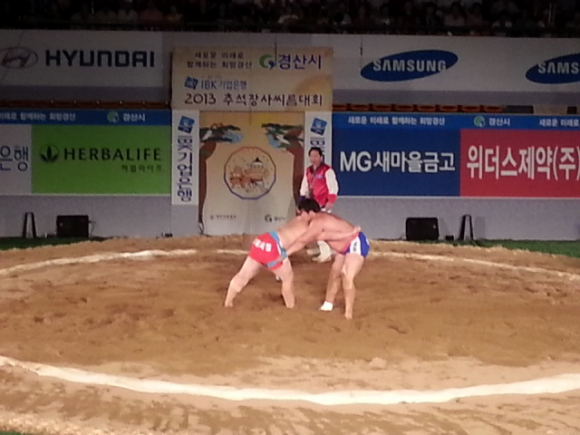 긴장된 경기 중에서도 땀을 너무 많이 흘리면 수건으로 상대의 어깨와 가슴의 땀을 닦아주는 흐뭇한 광경도 몇 번이나 있었습니다. 그런데 알고 보면 상대를 위한 것이 아니라 결국은 본인을 위한 행동이라고 합니다. 상대를 칭찬하고 올려주면 더불어 자기가 올라간다는 것과 같은 이치입니다. 그러나 여러 가지 기술로 온 힘을 모아 상대를 모래판에 무릎 꿇게 하는 승부에는 양보가 없었습니다. 이러한 모든 잔치는 승리자를 위해 준비되었고, 경기에 진 사람은 조용히 무대 뒤로 물러났습니다.