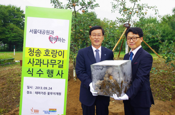 서울과 지역 간 자원순환형 창조경제 협력 모범사례 ‘눈길 끄네’ -청송군, 동물복지 차원에서 서울대공원에 사과 제공 -서울대공원, 비료화한 초식동물 배설물과 야생동물 피해 막는 호랑이똥을 청송 농가에 제공 청송군, 서울대공원 장미원에 ‘청송 호랑이 사과나무 길’ 조성