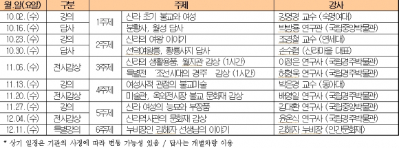 국립경주박물관(관장 이영훈)은 주부 등 일반 여성을 대상으로 10월 2일(수)부터 12월 11일(수)까지 매주 수요일 오전 10시부터 12시까지 수묵당에서『박물관 여성 문화강좌』를 진행합니다. 이번 강좌는 신라 여성들의 이야기를 주제로 강의와 답사, 전시감상 등 10회에 걸쳐 진행됩니다. 강의내용은 ‘신라초기 불교와 여성’, ‘신라의 여왕 이야기’ 등을 살펴보며, ‘신라 여성의 능묘와 부장품’, ‘여성사적 관점의 불교미술’ 등 다양한 주제로 신라 역사 속 여성들을 조명할 예정입니다. ‘박물관 여성 문화강좌’는 국립경주박물관 누리집 ‘교육 및 행사(신청 가능 교육)’에서 신청한 후 참여할 수 있습니다. 관심 있는 분들의 많은 참여를 바랍니다.