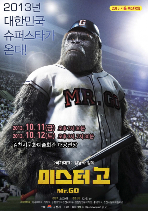 올 가을 황금들녘의 넉넉함과 더불어 시민들에게 즐거움과 감동을 선사할 영화 『미스터 고』의 관람료는 2,000원이며, 지정예매처(하나로마트, 이마트, 농협김천시지부, 김천농협부곡지점, 황금약국)와 문화예술회관에서 예매중이다. <문의 054)420-7824 〜 6, (http://www.gcart.go.kr)> |