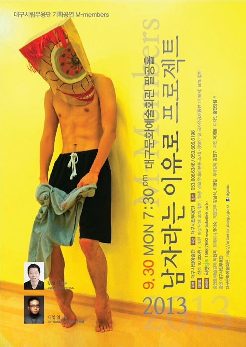 대구시립무용단 Men-Members 프로젝트 남자라는 이유로 총연출/예술감독 : 박현옥(대구시립무용단 예술감독 겸 상임안무자) 객원안무 : 이영일, 김남식 출연: 대구시립무용단 남자무용수 9명 (최상열, 문진학, 임현준, 김인회, 정진우, 박기범, 강현욱, 김경영, 오찬명) 일시: 2013. 9.30(월) 19:30 장소: 대구문화예술회관 팔공홀