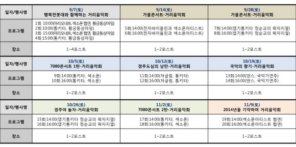 오는 28일에는 가을콘서트 ‘엽기통키타 정순교의 왁자지껄’, 10월 5일 7080콘서트1탄 ‘통키타, 섹소폰’, 12일은 경주도심의 낭만 ‘저글링, 통키타’, 19일은 국악의 향기 ‘댄스, 국악기연주’, 26일은 경주야 놀자 ‘엽기통키타 정순교의 왁자지껄’, 11월 2일 7080콘서트 2탄 ‘통키타, 섹소폰’ , 마지막 공연인, 11월 9일에는 2014년을 기약하며 ‘섹소폰아티스트 협연’이 펼쳐질 예정이다.
