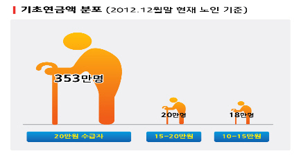 이번에 확정된 기초연금제도 정부안은 65세 이상 노인 중 상대적으로 생활여건이 나은 분들을 제외하고, 대상이 되는 70% 어르신의 거의 대부분(90%)인 353만명에게 당초 약속대로 20만원을 '14년 7월부터 지급하는 내용을 담고 있다.