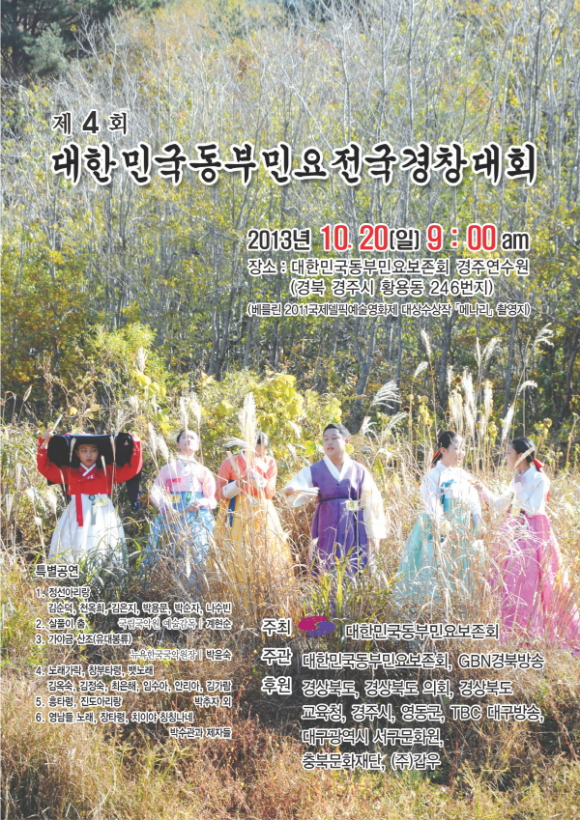 |  | | | ↑↑ 제4회 대한민국동부민요전국경창대회 포스트 | | ⓒ GBN 경북방송 | |