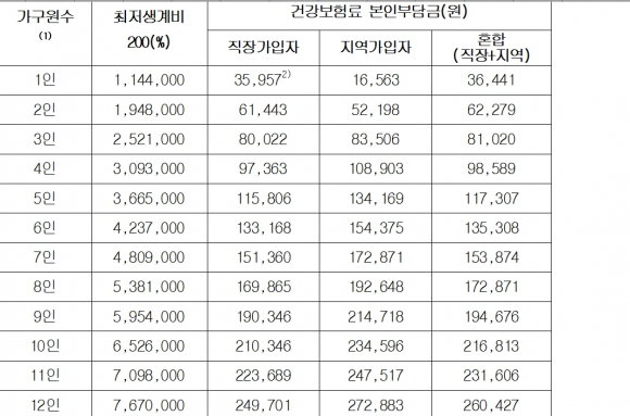 소득판정을 위한 건강보험료 기준(최저생계비 대비 200%)
