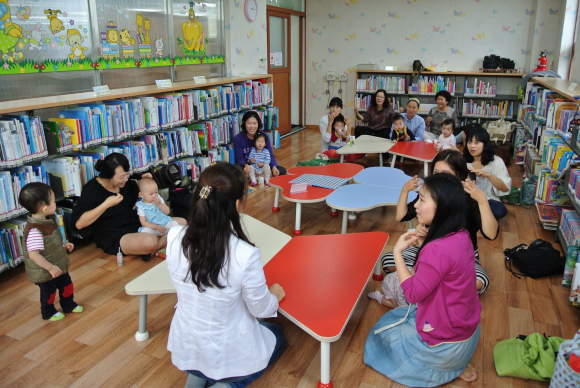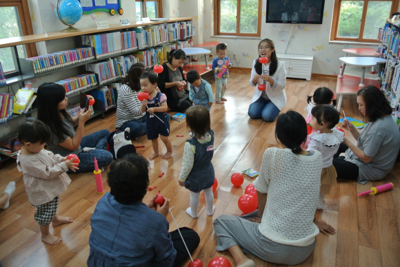 북스타트교실은, 10월 2일부터 11월 27일까지 8차시로 운영하며 매주 수요일 오후 2시, 3시 두 차례 열린다. 지난 2일 열린 1차시에는 “사과가 쿵!” 이란 타이틀로 전문강사의 구연동화와 풍 선을 이용한 사과우산 만들기, 애벌레송에 맞추어 엄마와 함께 율 동 따라하기 등 자유로운 분위기 속에서 진행 되어 참여자들의 호응도가 높았다. 프로그램에 참여한 가족들은 도시지역 문화센터 에서나 하는 프로그램을 분위기 좋은 장소에서 열어 준 보건소와 공공도서관에게 고맙다고 전했다.
