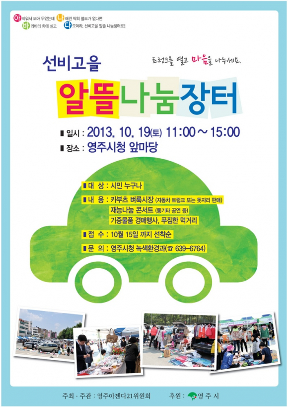 영주아젠다21위원회(위원장 서익제)는 오는 15일까지 영주시청 앞마당에서 카부츠 방식 선비고을 알뜰마당 사랑나눔장터를 열기위해 참가자를 모집한다.