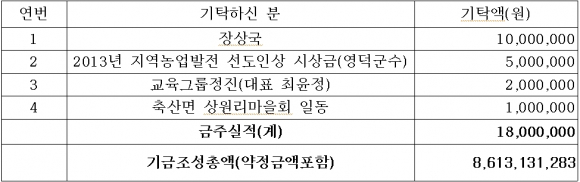 장상국 1,000만원, 교육그룹정진 200만원, 상원리마을회 100만원
