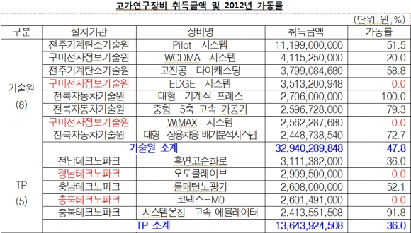 전주기계탄소기술원 등 3개 기술원이 329억원을 들여 구입한 8대의 장비의 활용률은 47.8%로 나타났으며, 전남테크노파크(TP)를 비롯한 4개 TP는 5대의 장비를 136억원에 구입하였지만 활용률은 36%로 가장 낮은 활용률을 보였다
