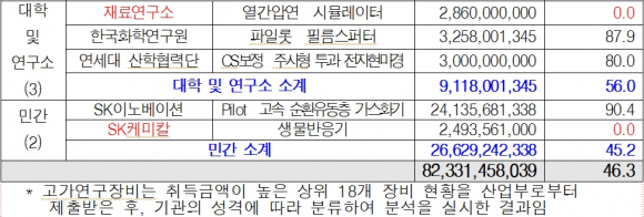 특히, 18대의 장비 중 6대의 장비는 작년에 가동한 실적이 전혀 없는 것으로 나타났는데, 기관별로는 기술원 2대, TP 2대, 대학 및 연구소와 민간에 설치된 각각 1대의 장비를 가동하지 않은 것으로 조사됐다.