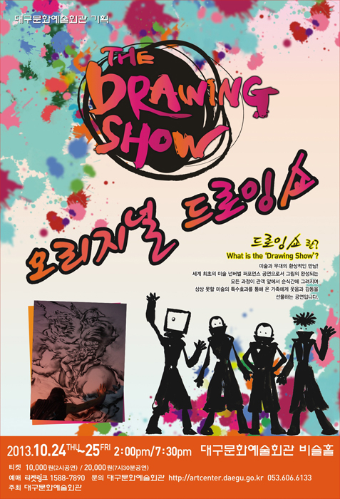 대구문화예술회관의 기획으로 마련된 이번 <오리지널 드로잉 쇼>는 세계 최초로 미술과 무대 퍼포먼스를 결합한 작품으로서, ‘완성된 그림’을 선보이는 것이 아닌 그림이 ‘완성되는 과정을 시연’하는 형식의 공연이다. 물감, 목탄 등 다양한 미술 재료를 이용해 무대를 캔버스 삼아 그림을 그리며 관객에게 특별한 재미와 감동을 선사한다. 또 살아 움직이는 놀라운 입체드로잉과 200개의 큐브로 그림을 그리는 큐브아트, 그리고 화려한 색채드로잉과 액션페인팅 등 관객들의 상상력을 자극하는 미술판타지가 화려하게 펼쳐진다.