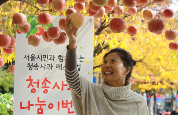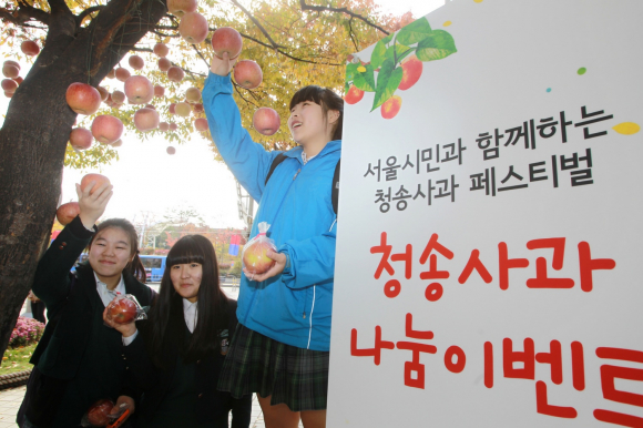 청송군, 16일 동대문구청·17일 남산 한옥마을서 ‘도심 속 청송사과 따기’ 이벤트 개최 단풍나무에 청송사과 매달고 무료 배포.. 도심 속 이색 즐거움 선사 29일~30일 서울 용산 아이파크몰 광장서 열리는 <2013 서울시민과 함께하는 청송사과 페스티벌>의 사전 홍보 일환