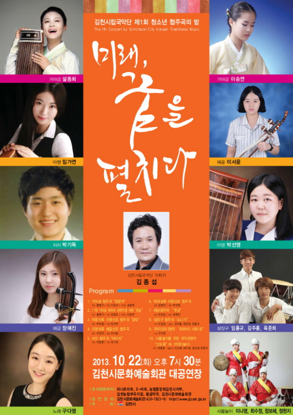 지난 7월 오디션을 통해 지역 출신 중․고등학생 및 대학생 등 총 10개팀의 협연자를 선발하여 김천시립국악단과 함께 3개월간의 연습을 거쳐 이번 무대에 오르게 된다.