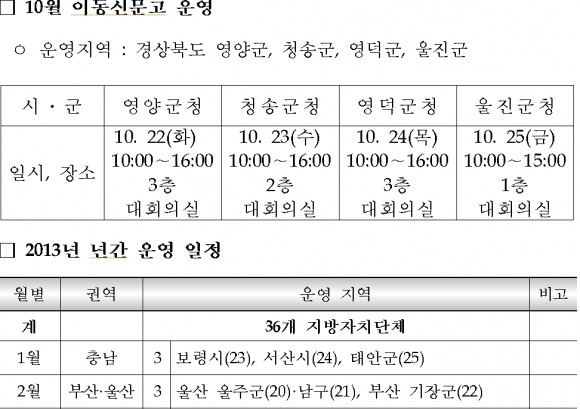 국민권익위원회(위원장 이성보)에서 운영하는 ‘이동신문고’가 22일 영양군청, 23일 청송군청, 24일 영덕군청, 25일 울진군청을 방문해 지역 주민들의 고충민원 상담을 실시한다.