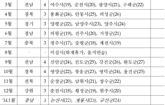 22일 영양군, 23일 청송군, 24일 영덕군, 25일 울진군