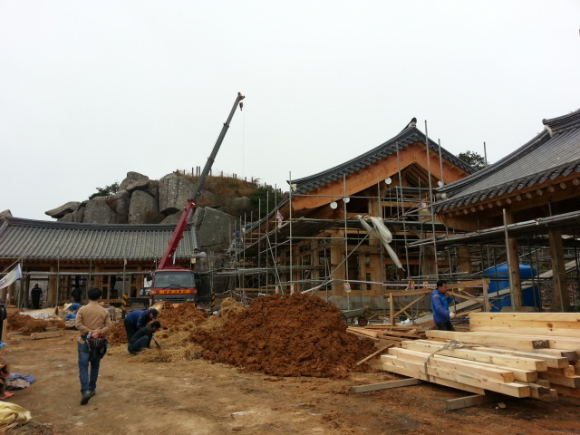 대열을 따라 부지런히 올라가니 풍광이 예사롭지 않은 곳 대견사지에 도착했습니다. 신라고찰인 대견사는 일연 선사가 22세에 승과(僧科)에 장원급제를 하고 44세까지 22년간 계시면서 삼국유사의 자료수집과 집필을 구상한 곳입니다. 또 임진왜란 당시 승병의 본거지였던 유서 깊은 곳이었으나 일제에 의해 강제 폐사(廢寺)되었습니다. 그 후 지난 9월에 동화사와 달성군이 국운융성과 민족통일을 염원하는 기도도량 조성을 위해 이곳의 중창불사를 시작했습니다. 폐사지(廢寺址)에 당시의 모습으로 중창하는 해방 이후 최초의 공사인 중창불사는 내년 3월1일 달성군 개청 100주년에 맞추어 완공예정입니다. 대견사지 앞쪽 바위 끝에 있는 탑을 보니 마치 설악산 봉정암의 사리탑이 연상되었고, 1000m 정도의 높은 곳으로 풍광 또한 수려하여 봉정암 정도의 영험이 있는 기도처가 될 것이라 확신이 들었습니다.