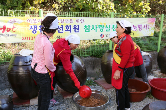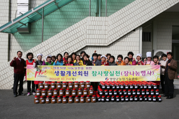 |  | | | ⓒ GBN 경북방송 | | 생활개선영양군연합회(장명옥)는 2013년10월24일 따뜻한 사랑이 가득담긴 장(간장, 된장)을 소외된 이웃들에게 나누어주기 위해 회원 30여명이 이웃사랑나눔행사를 가졌다.
