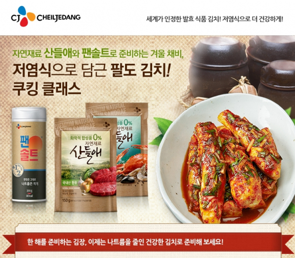 - 오는 6일, CJ제일제당 자연재료 산들애와 팬솔트로 저염식 팔도김치 쿠킹클래스 개최 - 정ㅇㅇ 요리연구가 나트륨 낮춘 5가지 건강한 김장법, 이색 채소 활용해 비법 전수