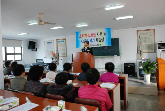 경주소방서(서장 김학태)는 6일 대한노인회 경주시지회 부설 노인대학(노서동 소재)에서 학생 및 자원봉사자 130여명을 대상으로 소화기·소화전 사용 및 CPR익히기 체험장을 운영했다.