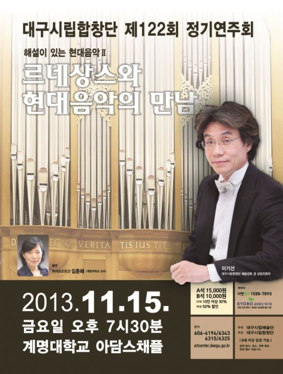 【참고자료】 공연개요 ○ 공연명 : 대구시립합창단 제122회 정기 연주회 <해설이 있는 현대음악 Ⅱ> “르네상스와 현대음악의 만남” ○ 일 시 : 2013. 11. 15. (금) 오후 7시 30분 ○ 장 소 : 계명대학교 아담스채플 ○ 주 최 : 대구시립예술단 ○ 주 관 : 대구시립합창단 ○ 지 휘 : 이기선 (예술감독 겸 상임지휘자) ○ 협 연 : 오르가니스트 김춘해 ○ 객원연주 : ○ 입 장 료 : 일반 A석 : 15,000원 / B석 : 10,000원 ○ 할인정보 : 학생 50%, 단체(10인 이상) 30% 장애인(동반 1인), 국가유공자, 60세 이상 노인(본인) 50% ○ 공연문의: 대구문화예술회관 홍보팀 053)606-6194