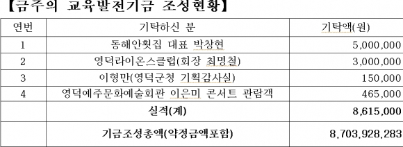 한편, 영해면에 소재한 영덕예주문화예술회관에서 열린 이은미 콘서트 관람객들이 자발적으로 기탁한 46만5천원을 교육발전기금으로 전달했다. 영덕예주문화예술회관은 영화, 뮤지컬, 콘서트 등 다양한 문화예술콘텐츠를 제공하고 있는 지역의 핵심적인 문화공간이다. 또한 영덕군청 기획감사실에서 근무하는 이형만씨가 15만원을 기탁했다.