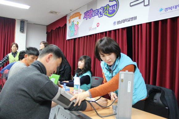 「사랑실은 건강천사」의료봉사는 공단 버스에 내과, 안과, 이비인후과, 치과 등 30여 가지 최첨단 의료장비를 싣고 전국을 다니면서 무료진료를 펼치는 봉사활동으로, 해당 봉사지역의 종합병원 의료진들과 협력해서 다양한 의료서비스를 제공하는데, 이날은 영남대학교와 경북대학교병원 의료진이 흔쾌히 참여하여 성황리에 실시했다.