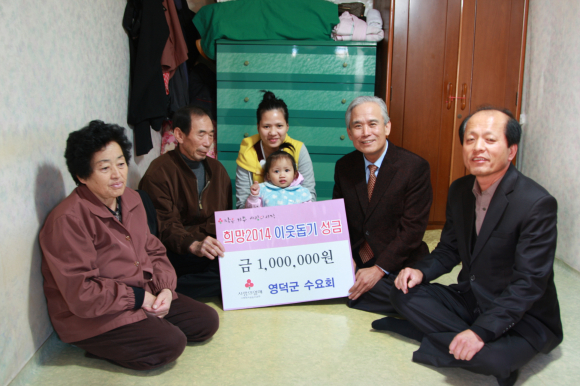 특히, 지난 20일(수) 영덕군 수요회 모임에서는 필리핀에서 시집온 다문화가족 중 지난번 하이옌 태풍으로 인하여 집을 잃고 막막하게 살아가는 친정집 걱정에 어찌할 바를 모르는 다문화가족이 있음을 알고 김병목 군수가 제의하여 수요회 회원들이 자원하여 불우이웃돕기성금 총 200만원을 모았다.
