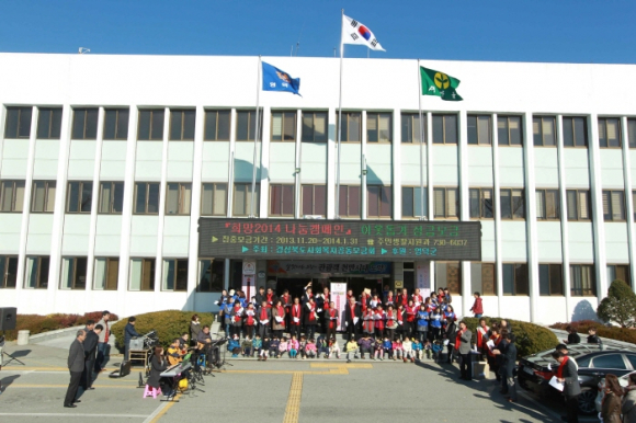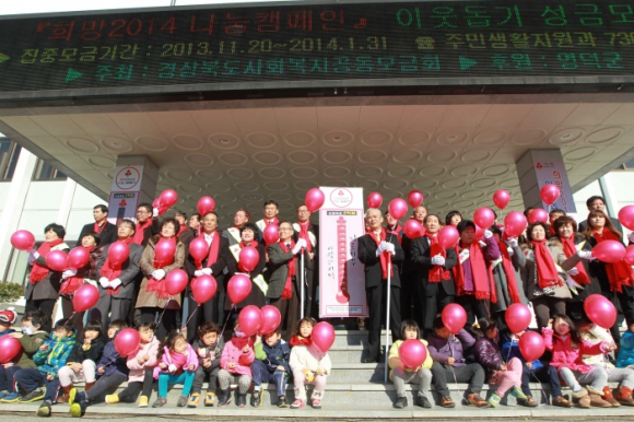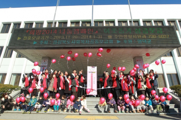 예년보다 10일 일찍 시작된 「희망 2014 나눔캠페인」은 20일부터 내년 1월 31일까지 실시된다. 이날 행사에서 재능기부로 군청음악동호회의 통기타공연과 주민생활지원과 직원 모두가 참여한 댄스 공연이 펼쳐져 추운 날씨였지만 미래에 대한 희망과 서로가 함께하는 기쁨 속에서 후끈한 분위기를 느끼게 했다. 또한 온도계 점화식에 맞추어 희망풍선 100개를 날려 보내며 어려운 이웃의 희망이 이루어지길 기원했다.