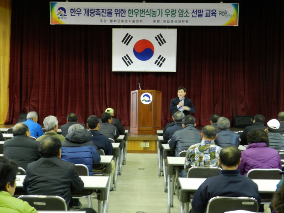 봉화군은 국립축산과학원 오영균(박사)와 함께 강소농현장접목연구사업 추진계획에 따라 지난 2년간 관내 한우사육농가에 사양시험을 통한 중간 결과를 발표하는 시연회와 국립축산과학원 한우시험장 이승환(박사)를 초청하여 “한우 우량 암소 선발”에 대한 교육을 11월27일(수) 한우농가 100여명이 참석한 가운데 개최하게 되었다.