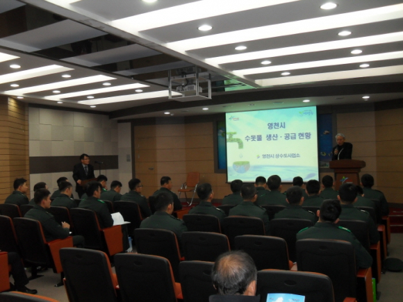 27일 영천정수장 홍보영상관에서 박효순사업소장의 안내로 육군3사관학교 건설환경학과 환경계열 4학년 생도생 25명과 교수 2명이 참석하여 수돗물 생산의 전 과정을 살펴보고 수돗물의 안정성을 확인했다.