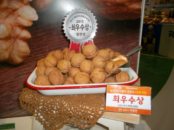 김천시는 지난달 29일 서울 한국농수산식품공사(aT)에서 한국과수농협연합회 주관으로 열리 ‘2013 대한민국 과일산업대전’ 에서 구성면 마산리 우리호두(대표 이영인)가 호두부분 최우수상을 수상하는 영예를 안았다고 밝혔다.