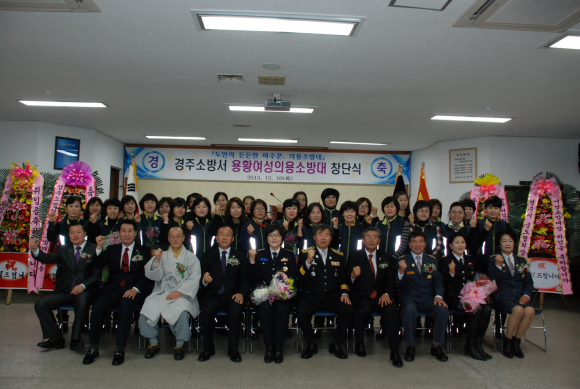 경주소방서(서장 김학태)는 10일 오전 경주소방서 대회의실에서 최양식 경주시장, 박병훈 도의원, 최학철 도의원 등 내외빈 100여명이 참석한 가운데 용황여성의용소방대 창단식을 가졌다. 용황 여성의용소방대는 공기업 이전 등으로 지역경제발전에 따른 인구증가와 상권의 발달로 소방 수요가 증가함에 따라 지난해 8월 여성소방대 설치의 필요성이 대두되었고, 10월에 설치승인을 받았다. 이날 창단식을 가진 용황여성의용소방대(대장 김혜규)는 총 30명의 여성의용소방대원으로 구성되었으며, 향후 황성동, 용강동, 현곡면, 천북면 지역 등에서 대형화재 진압지원 및 재난피해 복구 등의 소방지원 업무를 담당하게 된다. 김혜규 대장은 "지역에서 발생하는 각종 재난에 능동적으로 대처하고 봉사하는 소방행정 구현을 위해 여성의용소방대를 창설했다"며, "경주시민들의 재산과 생명을 보호하고, 소방서비스 확대를 위해 노력하겠다“고 창단소감을 밝혔다.