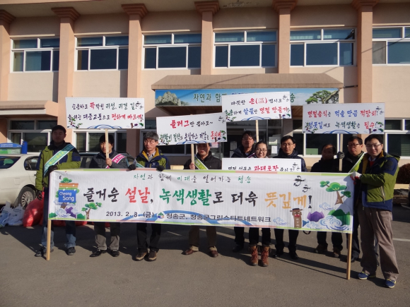 청송군은 2012~2013 정부합동평가 환경부문(환경개선부담금 등 9개 분야) 평가점수, 환경예산 확보, 특수시책 및 우수사례 실적 등 종합평가에서 최고 성적을 거두어「경북환경상」군부 최우수상을 수상하게 되었으며 저탄소 녹색성장 및 ECO-청송을 만들기 위해, 그린홈 닥터제 운영, 녹색명절보내기 캠페인, 찾아가는 기후학교 운영, 2013 맑은강 가꾸기 하천정화활동, 3R 자원 재활용품수집 경진대회, 찾아가는 이동환경연수원 유치를 통한 지역 그린리더(초급,중급과정) 양성 등 그린스타트 실천 및 기후변화 대응에 적극 노력하였다.