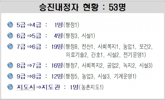 (직 제 순) ▶ 행정4급 외남면장 황원모 ▶ 행정5급 총무과 최원수, 안전관리과 류태모, 여성청소년과 안희성 ▶ 시설5급 도시과 장봉구 ▶ 지도관 농업기술센터 피정옥 ▶ 행정6급 공보감사담당관실 박병우, 안전관리과 윤태경, 새마을관광과 유헌종, 회계과 남정억, 교통에너지과 권양희, 중동면 송종환, 청리면 최길환, 은척면 이영숙 ▶ 전산6급 공보감사담당관실 김귀연 ▶ 사회복지6급 남원동 위창성 ▶ 농업6급 공검면 이형수 ▶ 보건6급 보건소 김송원, 서미자 ▶ 의료기술6급 보건소 윤은희, 김수영 ▶ 간호6급 보건소 박영순 ▶ 시설6급 민원봉사과 박진수, 도시과 김익영 ▶ 전기운영6급 문화체육과 정휘경 ▶ 행정7급 기획예산담당관실 최인석, 공보감사담당관실 김석진, 총무과 임종규, 회계과 류수민, 환경관리과 김도희, 의회사무국 노동현, 외서면 임재봉 ▶ 사회복지7급 공검면 김영아, 동문동 김명자 ▶ 공업7급 축산환경사업소 김광석, 여상의 ▶ 녹지7급 산림공원과 김범식, 서인식 ▶ 시설7급 민원봉사과 김경식, 건설과 이동순, 도시과 정이철 ▶ 행정8급 민원봉사과 조진영, 여성청소년관 권선미, 모서면 천성민, 북문동 고가형, 최한수 ▶ 농업8급 축산유통과 김민아, 화북면 이주호, 은척면 이슬기 ▶ 시설8급 내서면 윤호영, 모서면 김형준, 동문동 하홍석 ▶ 기계운영8급 공보감사담당관실 오환석 |