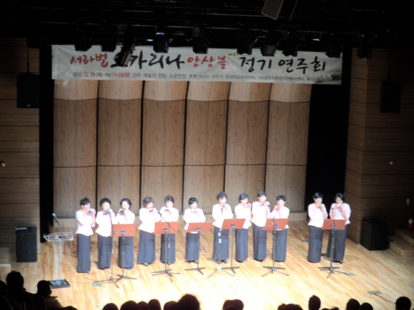 지도강사와 15명의 회원이 함께한 이번 정기 연주회는 소프라노, 메조소프라노, 알토, 테너로 이루어진 전체합주로 아름다운 하모니를 연주하며, 쉽고 다양한 기획연주(중창, 독주)로 시민들이 쉽게 접할 수 있도록 했으며, 경주시에서 맹활약 중인"하늘호"가 특별출연하여 보다 친근한 음악과 선율로 관객에게 큰 감동을 선사했다.