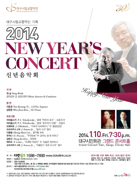● 지 휘 : 곽 승 (Sung Kwak) _ 음악감독 겸 상임지휘자(Music Director & Conductor) ● 출 연 : 이윤경(소프라노), 김완준(테너) ● 일 시 : 2014년 1월 10일 (금) 7:30 PM ● 장 소 : 대구시민회관 그랜드 콘서트홀 ● 입장료 : 일반 전석 10,000원 발코니석 전석 5,000원 ● 예 매 : 티켓링크 1588-7890 / www.ticketlink.co.kr ※ 공연일 오후 5시 30분까지 인터넷 및 전화(1588-7890) 예매 가능 ● 문 의 : 대구시립교향악단 053-250-1475