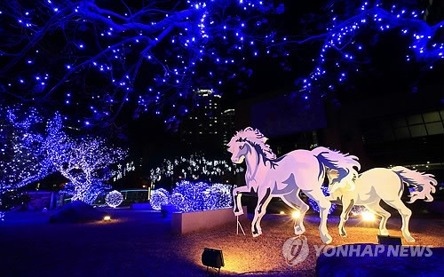 갑오년은 하루 중 가장 뜨거운 낮의 기온과 한여름의 열기 아래 푸른 말이 초원을 무한질주하는 가장 역동적이고 활발한 에너지가 넘치는 해입니다. 이러한 말은 왕과 귀족이 타고 다녔으며 장수들이 전장에서 세상을 평정코자 타고 달렸습니다. 풀과 야채를 먹으며 온순하지만 힘이 세고 매우 빠르게 움직이는 동물인 말, 이러한 청마의 진취적 기상과 역동의 의미를 형상화한 불빛이 대구은행 본점의 열린광장에서 빛나고 있습니다.