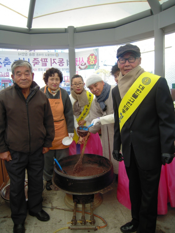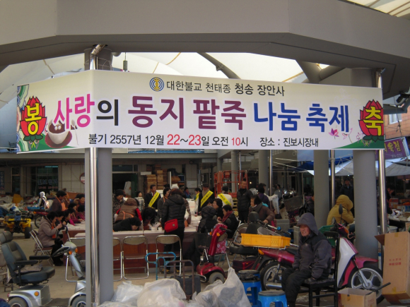 |  | | | ⓒ GBN 경북방송 | | 대한불교 천태종 청송 장안사(주지 탄성스님)에서는 동짓날을 맞아 지난 22,23일 오전 진보 시장내에서 사랑의 동지 팥죽 나누기 행사를 실시했다. 하루 전날 팥을 삶아 팥물을 거르고, 신도들의 손을 모아 만든 새알을 만들어 추운 날씨에 시장에 나온 상인과 주민들 200여분께 사랑과 정성이 가득 담긴 팥죽을 대접해 드렸다. 해마다 동지 팥죽을 쑤어 절을 찾으시는 신도들과 함께 하였으나, 올 해는 더 많은 이들과 함께 하기 위해 장날에 맞춰 거리로 나오게 되었다며, 추운 날씨와 여러 사회경제적 사건들로 상인들과 주민들의 얼어붙은 몸과 마음에 이 사랑의 팥죽으로 온기가 전달되길 기원했다.
