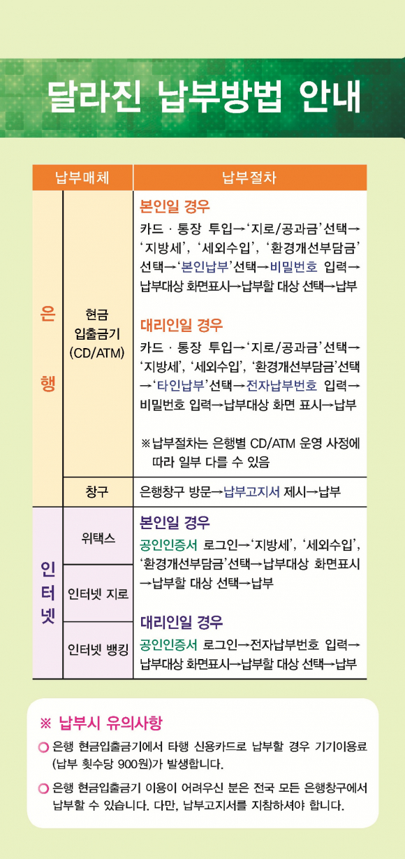 또한 인터넷뱅킹, 위택스, 인터넷지로를 통해서도 전국의 지방세외수입과 환경개선부담금을 한번에 일괄 납부할 수도 있게 된다.