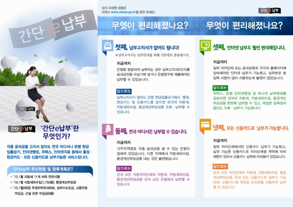 지금까지는 지방세외수입과 환경개선부담금의 경우 납부고지서(OCR)를 공과금전용수납기에 넣거나 은행창구에 제출해야 납부할 수 있었지만, 「간단e납부」서비스의 본격 시행으로 인해 1월 부터는 납부고지서를 가지고 가지 않아도 전국 모든 은행의 CD/ATM기에서 통장 또는 신용(현금)카드를 이용하여 납부할 수 있게 되었다.