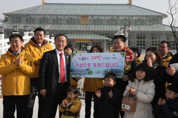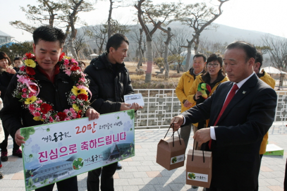 |  | | | ⓒ GBN 경북방송 | | 경주의 새로운 관광명소로 자리 잡은 경주동궁원은 2014년 1월11일 개장 120여일 만에 20만명의 관람객을 돌파했다. 이에 경주시는 동궁원을 찾아 준 방문객에게 감사의 마음을 전하고 고객감동을 통해 다시 찾고 싶은 동궁원을 만들기 위해 “20만번째 고객 감사 행사”를 마련했다. 이날 동궁원의 20만번째 고객인 조대국(43세), 조용태(40세)씨 가족에게 경주시장은 동궁원 입장권과 기념품을 직접 전달했다. 20만번째의 방문객으로 선정된 조대국씨 가족은 청송군 안덕면에서 겨울방학을 맞아 동생 조용태씨 가족과 함께 새해 첫나들이에 나서 행운의 고객으로 선정되었으며, “추운 겨울철 따뜻한 실내 관람 공간으로 아이들에게 동식물을 직접 체험해 주고 싶어서 왔다.”고 했다. 대부분 겨울철 경주 관광지는 야외 볼거리 위주였는데, 실내에서 즐길 수 있는 체험 아이템으로 경주동궁원은 “겨울철 최고의 나들이 코스”로 인기를 누리고 있다. 또한 초본 및 목본류 등 식물의 생장변화를 사계절 관찰할 수 있는 동궁식물원과 동물의 행동을 직접 체험․관찰할 수 있는 경주버드파크, 동시에 농업체험이 가능한 우리나라 유일의 복합문화공간으로 2014년도 수학여행 및 학생단체 관람객에 대한 문의가 꾸준히 이어지고 있다.