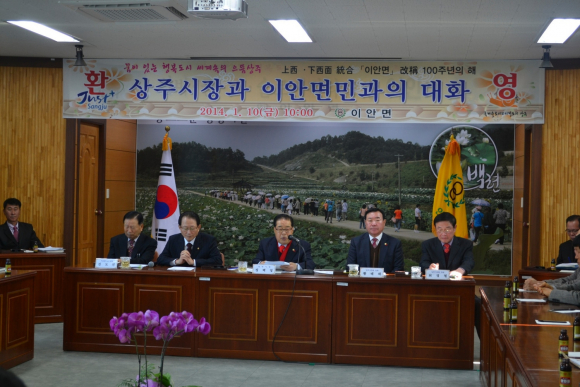 성백영 상주시장은 10일 2014년(甲午年) 새해를 맞아 행정의 최일선 기관인 이안면사무소를 방문하여 새해 업무 추진방향을 점검하고 주민과의 간담회를 가졌다. 이날 간담회에는 김도진 노인회장, 김종태 국회의원, 한재석 도의원, 황태하, 최경철 시의원, 채종태 이장협의회장 등 70여명의 주민대표가 참석한 가운데 안룡 ~ 구미간 도로 확․포장공사의 조기완공 등 지역 발전을 위한 다양한 의견들이 제시되기도 했으며,