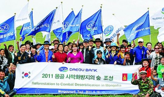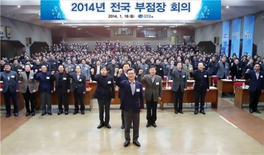 행사의 시작에 앞서‘고맙습니다. 그리고 달립시다.’코너가 있었습니다. 모든 불을 끄고 영상물과 함께 잔잔히 들려오는 소리는 ‘오늘 이 자리가 있기까지 부모님과 가족이 있었고 바르게 가르쳐주신 선생님이 계셨습니다. 또 함께 크고 자라온 친구와 동료 그리고 삶의 터전인 고마운 직장 덕분에 모두 이 자리에 앉아 있습니다. 태산 같은 직장인 우리 대구은행이 초일류 지역은행으로 성장하기까지 47년간 땀과 열정을 바친 선배님이 계셨고 가족처럼 아끼고 성원해주신 고객님과 지역이 있었습니다. 이처럼 좋은 직장을 더욱 발전 시켜야 하는 과제가 이제 우리 앞에 주어져 있습니다. 저 넓고 푸른 초원을 거침없이 달리는 청마와 같이 우리는 힘껏 달려야 할 출발선에 서 있습니다. 청마의 기상으로 2014년 전국부점장 회의를 힘찬 출발을 알리는 종소리와 함께 시작하겠습니다.’라는 멘트에 이어서 울린 종소리는 깜깜한 강당의 어둠을 깨치며 깊숙한 가슴 저 아래에서 뜨거운 감동과 고마움을 자아내고, 대구은행의 깃발을 들고 몽골의 초원에서 힘차게 말을 타고 달리는 자의 모습을 담은 영상물은 우리 함께 앞을 향해 힘껏 달려야겠다는 결연한 마음을 갖게 하였습니다.