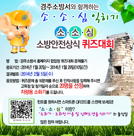 |  | | | ⓒ GBN 경북방송 | | 경주소방서(서장 김학태)는 2014년 안전한국 국민행복 실현을 위한 「소·소·심 캠페인」추진방안의 일환으로 홈페이지를 활용한 소방안전상식 퀴즈대회를 개최한다고 20일 밝혔다. 이번 소·소·심 소방안전상식 퀴즈대회는 화재 등 재난발생시 생명을 보호하는데 필수적인 소화기·소화전 사용 및 심폐소생술 익히기를 일반 시민들이 생활속에서 쉽게 익힐 수 있도록 홍보하기 위해 마련되었으며, 경주소방서는 퀴즈대회 외에도 홈페이지를 활용한 소·소·심 동영상 QR코드 보급 등 다양한 방법을 통해 소·소·심 홍보를 추진해 나갈 계획이다. 퀴즈대회 개최기간은 1월 20일부터 29일까지 10일에 걸쳐 실시되며 경주시민이면 누구나 경주소방서 홈페이지(http://www.gj119.go.kr)에 접속해 퀴즈문제를 풀 수 있다. 퀴즈문제는 총 10문제로 소·소·심 관련 소방안전상식 관련 내용이며, 고득점자 및 참가 순서가 빠른 순으로 30명을 선정하여 차량용 소화기를 1대씩 지급한다. 입상자는 경주소방서 홈페이지 공지사항 게재 및 개별 통보되며 기타 자세한 사항은 경주소방서 홈페이지 및 경주소방서 예방안전과(054-778-0541)로 문의하면 된다. |