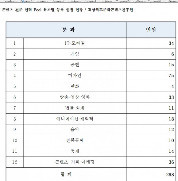 경상북도문화콘텐츠진흥원(원장 김준한)은 2013년 4월부터 12월까지 신청접수 및 심사를 통해 268명을 콘텐츠 전문 인력으로 등록하여 문화콘텐츠 관련 사업의 심사·자문·추진위원 및 강사, 객원연구원으로 활용하기 위한 ‘콘텐츠 전문 인력 Pool'을 구축했다.