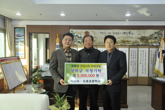 봉화읍 문단1리(이장 정명하) 주민일동은 22일 봉화군청을 방문하여 (사)봉화군교육발전위원회에 장학기금 5백만원을 기탁하면서 교육여건 열악과 학생수 감소로 어려움에 처한 봉화읍 도촌초등학교로 지원해 줄 것을 요청했다.