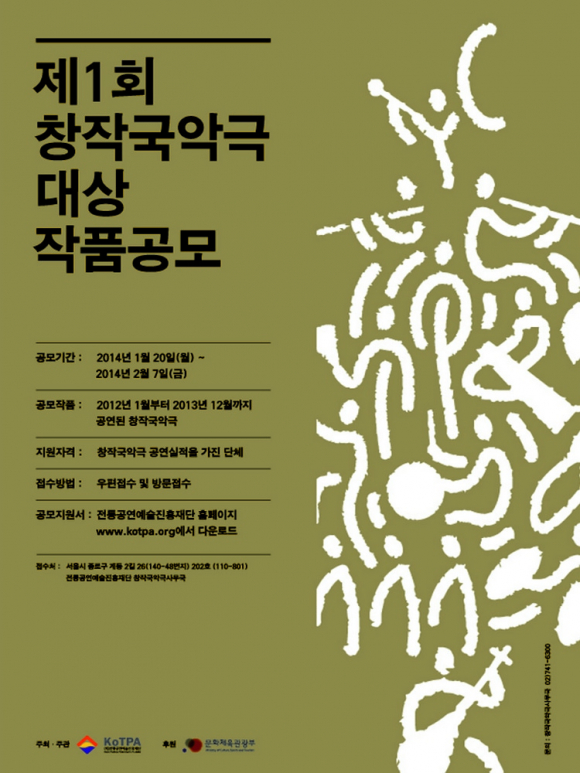 < 공 모 개 요 > 공 모 명 : 제1회 창작국악극대상 작품공모 공모기간 : 2014년 1월 20일(월) ~ 2014년 2월 7일(금) 공모작품 : 2012년 1월부터 2013년 12월까지 공연된 창작국악극 지원자격 : 창작국악극 공연실적을 가진 단체 작품기준 - 전통을 바탕으로 새롭게 창작한 작품 - 기존 작품을 모티브로 현대적으로 재해석 한 작품 - 전통음악의 특징이 잘 표현된 작품 지원방법 - 접수방법 : 우편접수 및 방문접수 - 접 수 처 : (110-801) 서울시 종로구 계동 2길 26(140-48번지) 202호 전통공연예술진흥재단 창작국악극사무국 - 제출서류 ․ 공모지원서 5부 ․ 대본 5부 ․ 공연영상(DVD) 2장 ※ 전통공연예술진흥재단 홈페이지 www.kotpa.org 에서 참가지원서 다운로드