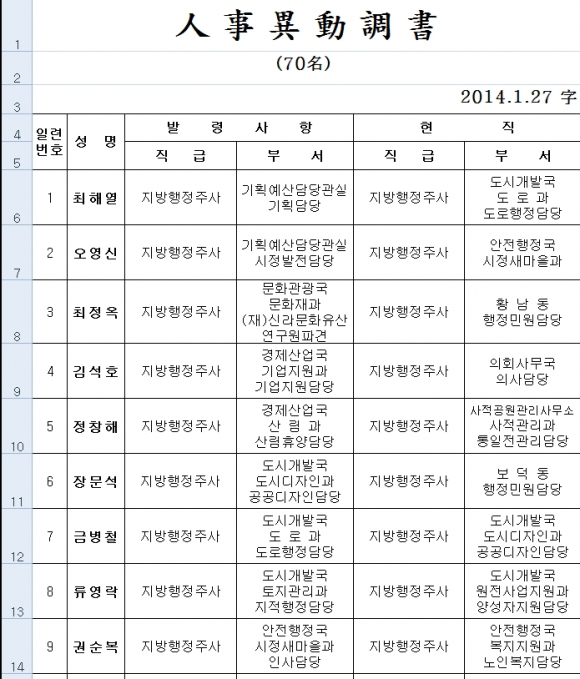 경주시는 상위직 결원, 명예퇴직, 직제개편, 장기 교육훈련 등의 인사요인에 따라 2014. 1. 27.자로 6급이하 공무원 227명, 신규임용 33명에 대한 전보 및 파견인사를 단행했다.