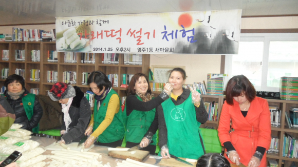 영주1동 새마을회(협의회장 윤용남, 부녀회장 최미영)에서는 25일 영주1동 새마을회관에서 민족 고유의 명절인 설을 앞두고 관내 다문화가족 8가구와 새마을회원등 약 30여명이 참여한 가운데 다섯 번째 “사랑의 가래떡 썰기” 전통문화 체험활동 했다.