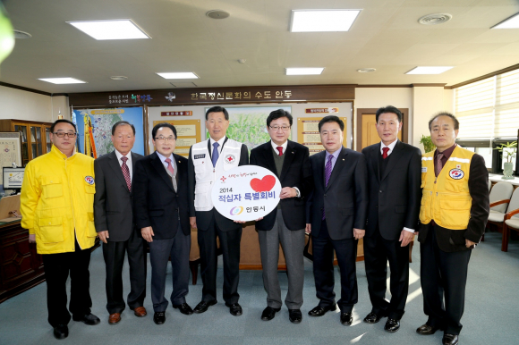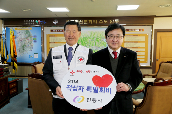 권영세 안동시장이 29일 강보영 대한적십자사 경북지사회장 및 관계임원들의 예방을 받은 자리에서 “2014년도 적십자 특별회비”를 전달했다. 권영세 안동시장은 이 자리에서 “크고 작은 재난이 발생하면 언제나 가정 먼저 보이는 것이 노란조끼의 빨간 적십자라면서, 작년 임하댐 헬기 추락사고 때 보여준 봉사정신이 안동시민들에게 깊은 인상을 남겼을 것이다”라는 뜻을 전했다.